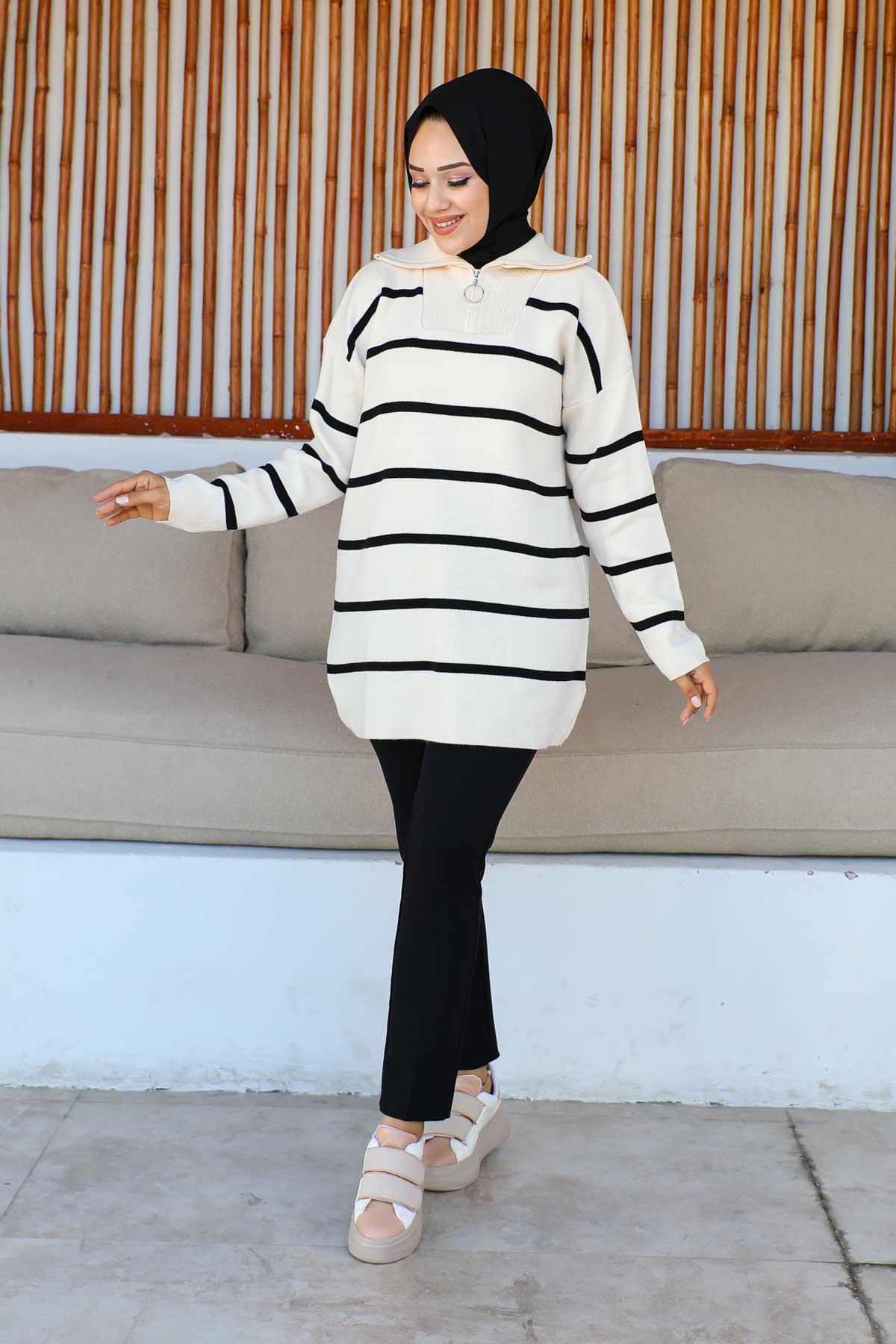 Bej Yaka Fermuarlı Çizgili Triko Tunik